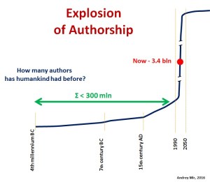 But now, all of a sudden, thanks to the Internet, more than 2 billion people have free access to public authorship. In the space of approximately twenty years – the blink of an eye, historically speaking – more authors have appeared than during the previous 6,000 years of literary civilization. (By authors I mean people capable of publishing their views beyond the reach of their personal contacts.) From 300 million across all history to 2 billion or more within a mere fragment of time: this is a real explosion in authorship.