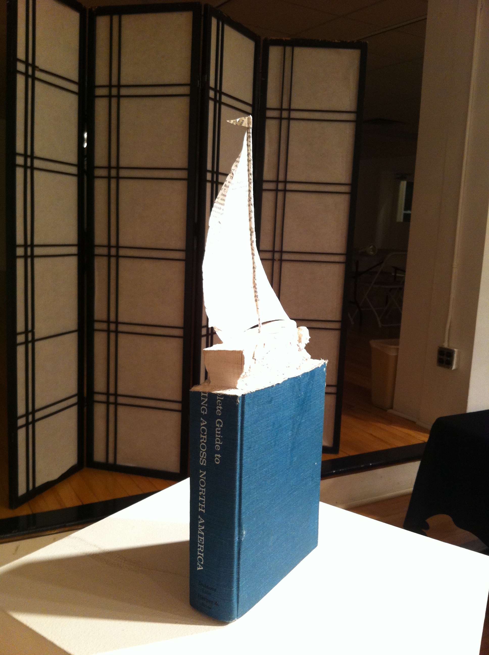 It was a cozy evening event organized by a local library in a small town. Anyone who wished to participate had been encouraged to pick up discarded books from one of six Prince Edward County libraries and produce something new from them. And voilà! Here is a sculpture-like dress made from glued book pages. There is a table lamp where a book is a pedestal upon which the two-sided picture shade emits the soft light. Next to them, a small beautiful sailboat is carved from the top end of a volume whose bottom end remains the intact half of the book. Yes, the remains of the book. Nobody reads this book anymore but it can still induce a romantic image. For the last time.