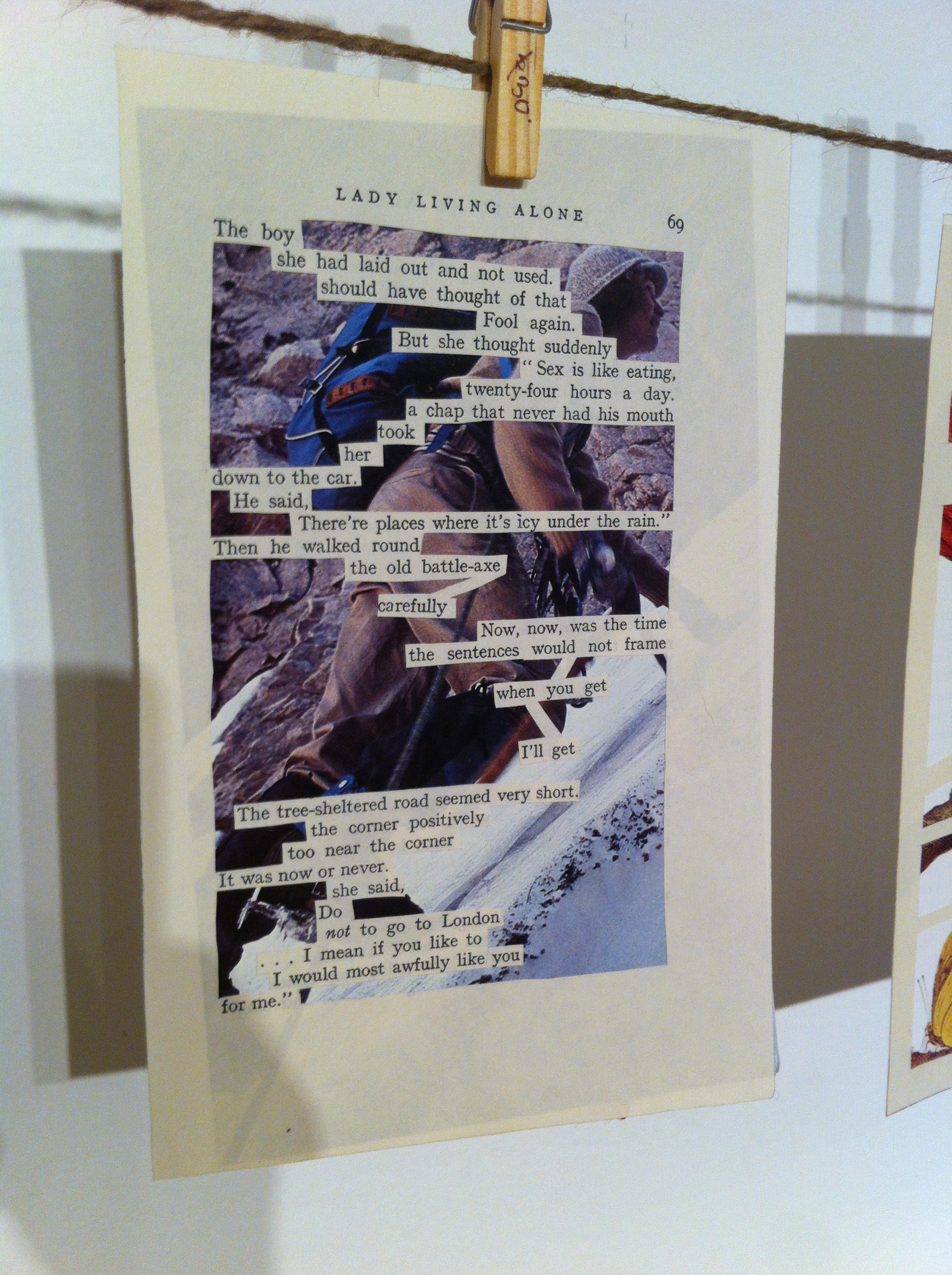 Of course, someone from the printing era – Typographic Man – will try to give an old book a new reading in this situation. I know such a one. Andrew McLuhan, a Picton resident, participated in the DiscARTed Art show. He certainly does share my feelings about destroying the books. That is why he felt his job was to safeguard the destiny of the books even while reprocessing them. Andrew scrutinized some books, then took a sharp knife and physically cut out lines and words in such a way that created a form of poetry whose lines look randomly combined, but thanks to Andrew’s will, are filled up with a new meaning. Next, this new poetry from the old text was placed atop of a picture (from another discarded book), so that the picture and poetry play together. It is a completely new reading of old pages. And it is still about pages, still about reading, but it is a new piece of art, at the same time. I now own a couple.