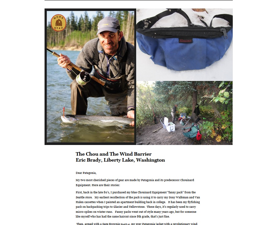 The fact that these stories are edited is apparent. However, every once in a while you see pearls that could not have been created by a copyrighter. For example, “Dear Patagonia, I’m a mid-90’s Puff Ball pullover down jacket, and I’m no longer acceptable wear in a social situation. My compadre, Jimbo, and I first joined forces many adventures ago. I was shiny and bright-red, less-so now, but then, hey, he was a little less-worn 15 years ago too…”