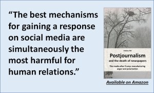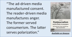The media system based on ad revenue manufactured consent. The media system based on soliciting the audience’s support manufactures anger. The ad-driven media produced happy customers. The reader-driven media produce angry citizens. The former served consumerism. The latter serves polarisation.