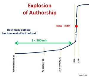 Whether via blogs, web sites, tweets, Facebook comments or Tumblr images, in the last 20 years or so more “authors” have appeared than during the previous 6.000 years of literary civilization. A greater proportion of the population is afforded the means to speak out and given the encouragement to do so. Self-publishing is turning into an opportunity previously unknown to most ordinary folks for most of human history.