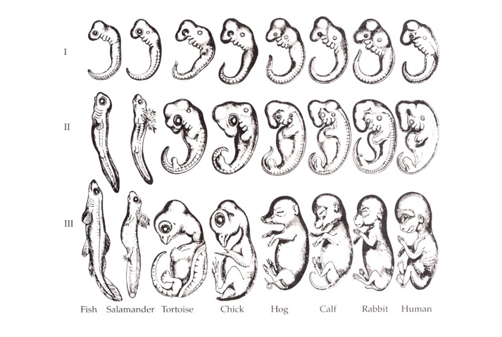 In biology, the concept of biogenetic or embryonic recapitulation implies that “ontogeny recapitulates phylogeny”—an individual repeats the evolution of its species. For example, the human embryo develops features resembling gill arches, a tail, and so on. Modern biology does not recognize recapitulation as a law, but this idea might provide a useful metaphor.
