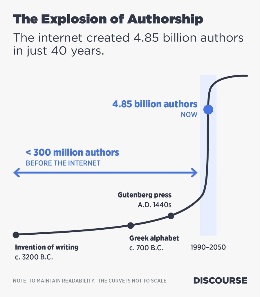 Before the internet, humankind had had about three hundred million authors, meaning people capable of delivering their messages beyond their physical reach.[22] The internet emancipated the authorship of ordinary people, irrespective of their capacity to produce meaningful content. We are living through an unprecedented explosion of authorship.