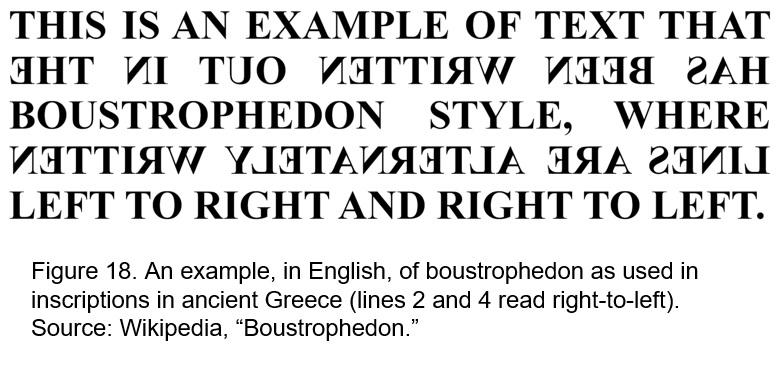 The fact that alphabetic script itself struggled to detach from the continuity of flow is best illustrated by boustrophedon, an early style of alphabetic writing in which letters shaped a sort of “uninterrupted” flow of speech. It simulated the way in which a farmer plowed a field with an ox. The word “boustrophedon” (βουστροφηδόν) in Ancient Greek meant “like the ox turns [while plowing].”