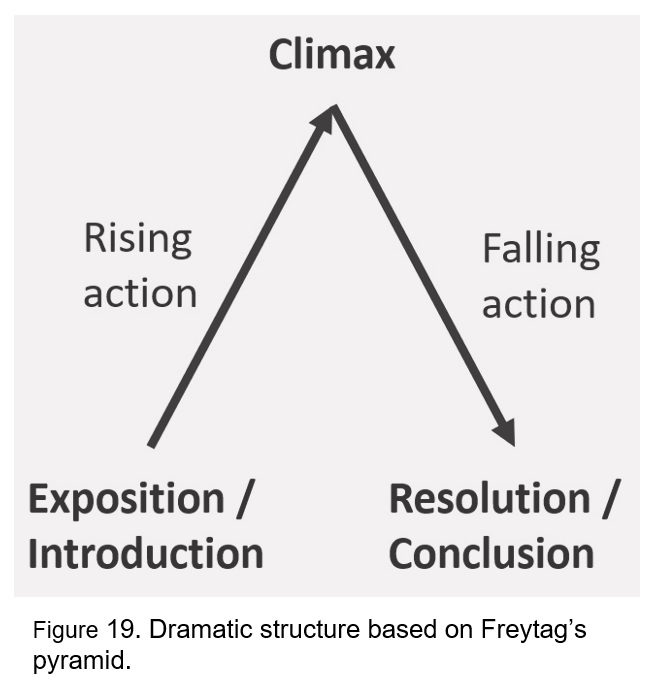 Fragmentation as disassembling entailed re-assembling – intellectually organized structuring. Structuring became the secondary effect of fragmentation. A general structural pattern appears common to all texts: introduction, body, and conclusion. It emerged naturally in the environment of writing but was reflected upon in categories, starting with Aristotle’s Poetics and extending to the modern Freytag’s pyramid of a dramatic arc: introduction, rise, climax, return or fall, and catastrophe.