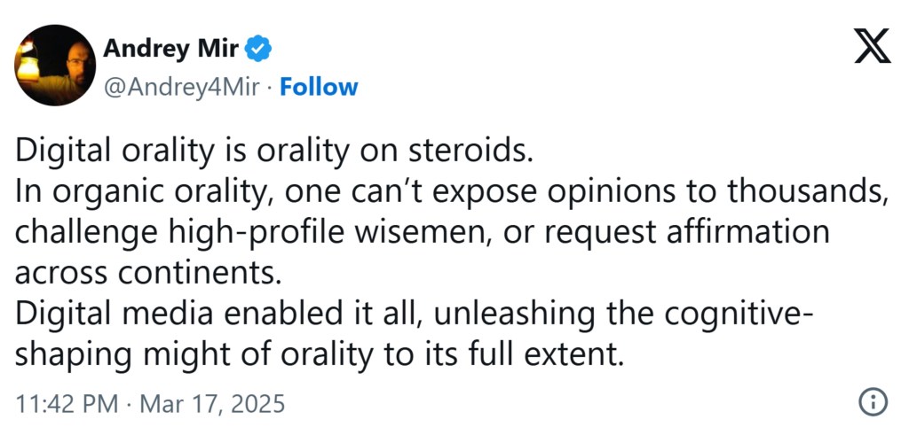 In organic orality, one cannot expose opinions to thousands, challenge revered wise men, or request affirmation across continents. Digital media enables it all, unleashing the cognitive-shaping might of orality to its full extent. Digital orality is orality on steroids.