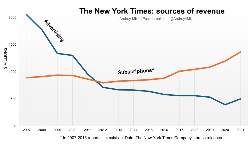(Experts know that later the New York Times demonstrated subscription growth unmatched in the industry, but it had little to do with subscriptions to news. Most of the growth came from other products and packages.)