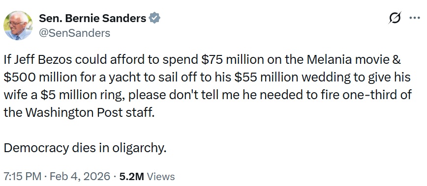 The loudest voice – garnering 5 million views on X in two days – was Senator Sanders’s, who said: “ If Jeff Bezos could afford to spend $75 million on the Melania movie & $500 million for a yacht to sail off to his $55 million wedding to give his wife a $5 million ring, please don’t tell me he needed to fire one-third of the Washington Post staff. Democracy dies in oligarchy.”