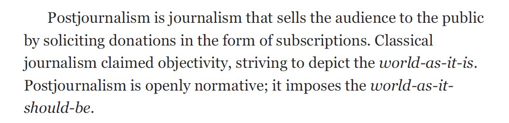 Now, with ad money, news, and audiences having fled to internet platforms, the ad-based business model is gone. The media turned to desperate attempts to attract subscribers. Journalism mutated into postjournalism: mass media began soliciting subscriptions in the form of donations to a cause, which inevitably politicized them.